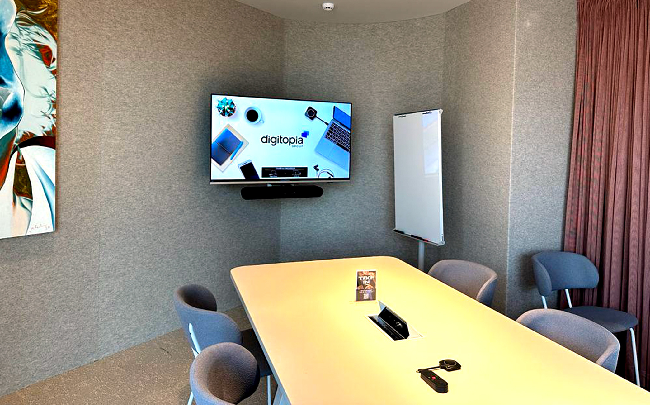 La conférence ClickShare est connectée sans fil à l'équipement des salles de réunion de l'ibis. En quelques secondes, les clients de l'hôtel peuvent organiser des conférences avec la barre vidéo, les microphones externes et les haut-parleurs de la salle. C'est ce que permet le mode BOYD de ClickShare.